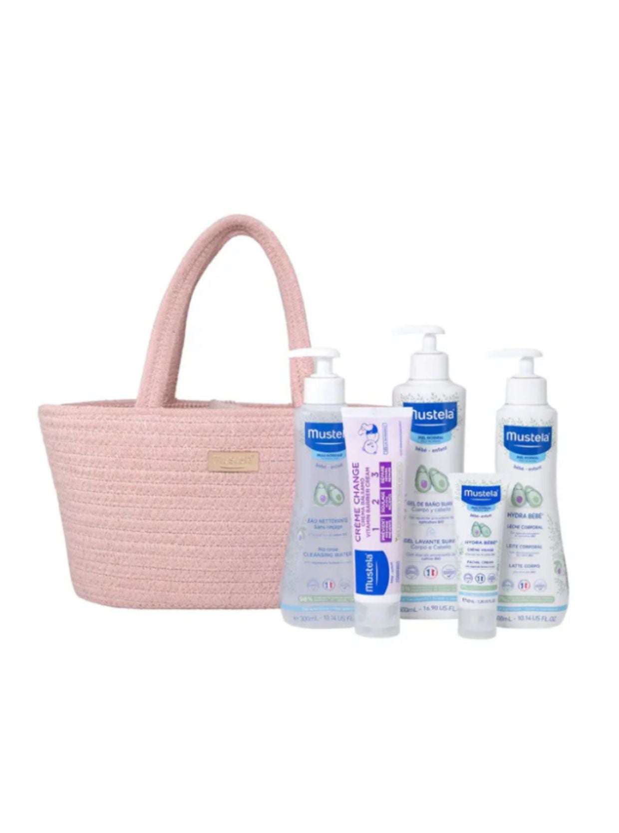 As Cestas "Os Essenciais" com a assinatura Mustela, a versatilidade aos cuidados mais especializados. Disponível em 3 cores e com um moderno design exclusivo. Contém os produtos: Água de Limpeza (300ml), Creme Zona da Fralda 123 (50ml), Gel Lavante (500ml), Hydra Bebé Creme Rosto (40ml), Hydra Bebé Leite Corporal (300ml)