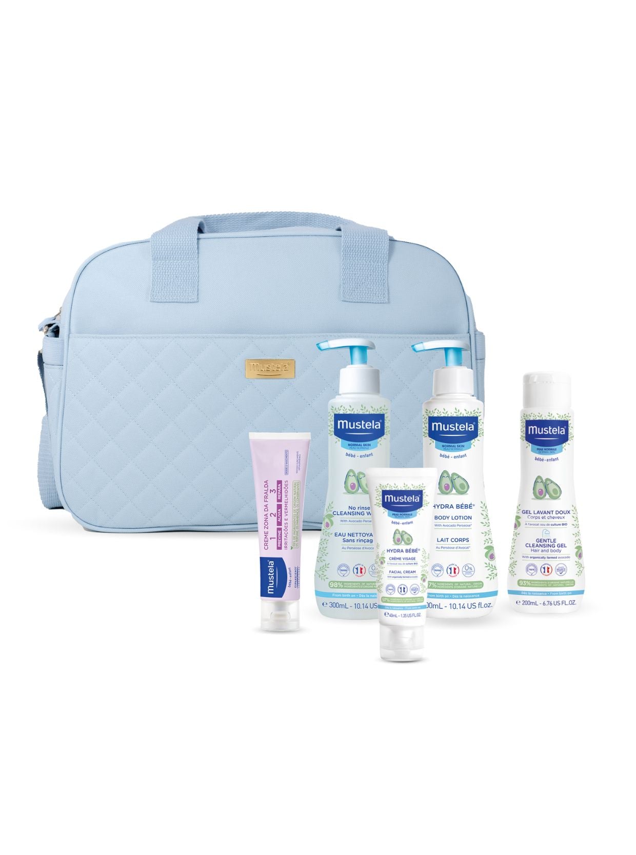 As Malas da Maternidade com a assinatura Mustela, alia a praticidade e versatilidade aos cuidados mais especializados. Disponível em 3 cores e com um moderno design exclusivo. Nova composição, com os produtos: Água de Limpeza (300ml), Creme Zona da Fralda 123 (50ml), Gel Lavante (200ml), Hydra Bebé Leite Corporal (300ml), Hydra Bebé Rosto (40 ml).